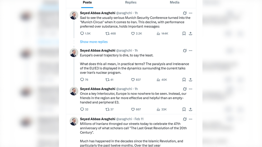 به گزارش خبرگزاری ایران پرس، سید عباس عراقچی گفت مایه تأسف است که کنفرانس امنیتی مونیخ، که معمولاً رویدادی جدی و معتبر تلقی می‌شد، در موضوع ایران به «سیرک مونیخ» تبدیل شده است. این افول، که در آن ظواهر بر محتوا ترجیح داده می‌شود، پیام‌های مهمی در بر دارد.